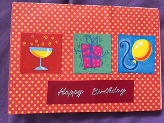 This is a quick, informal card (perhaps in the way that Mary Berry means when she says informal) that is suitable for someone of any age and gender. I used a piece of red and yellow polka dot paper to cover a card blank which I decided to use in landscape orientation. The three pictures mounted onto it are cut from an old birthday card I received - there's nothing wrong with recycling! I added the words 'happy birthday' from a pack of silver outline stickers, mounted onto a piece of red card.