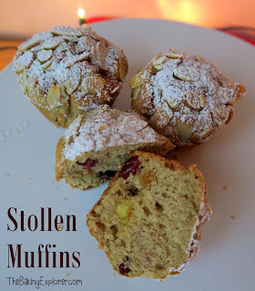 Kat, aka The Baking Explorer, certainly moved into uncharted territory with these stollen muffins - I've never come across this idea before. If you don't have the 2 hours spare that stollen needs to prove, these muffins are much quicker! They are full of Christmas spices, fruits and marzipan and look really good.