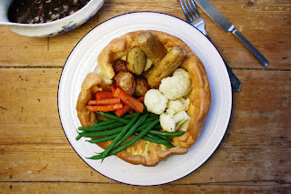 Here's a great idea from Dom at Belleau Kitchen - a Yorkshire pudding dinner plate. Basically you can serve an entire roast dinner, or anything else, on top of a giant Yorkshire pudding and then eat that too! It's been ages since I've had one of these but it might be making a reappearance on my menu soon.